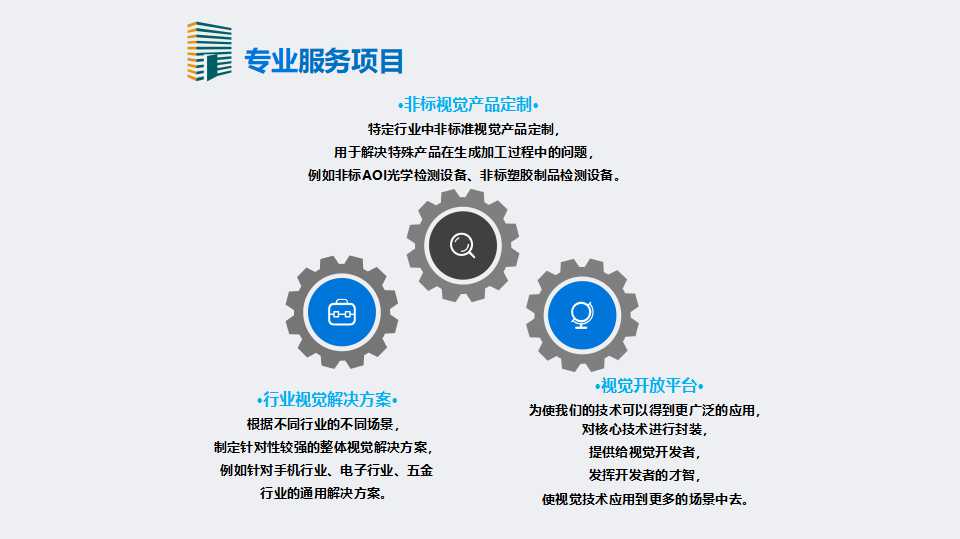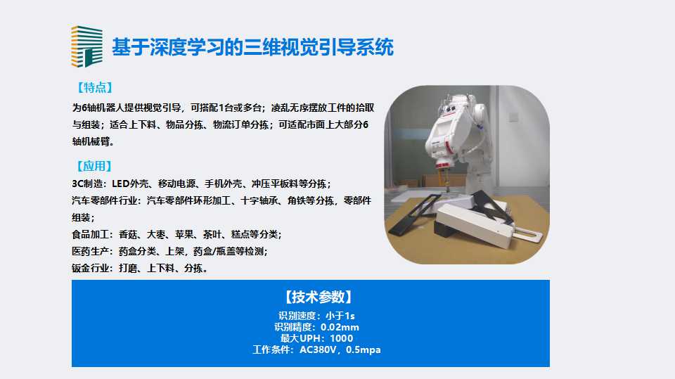 辰视智能拥有基于深度学习的三维视觉引导、机器人运动控制、视觉检测、三维建模等方面的核心技术,并研发了机器人三维视觉引导系统 、机器人二维视觉引导系统、三维检测系统、产品外观检测系统等可根据客户需求定制化的智能产品。以高效·低成本·模块化的方式为自动化集成商、自动化设备厂商、机器人厂家提供机器视觉的相关解决方案。