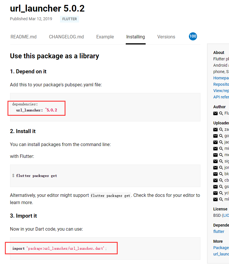 打开https://pub.dartlang.org/,然后搜索url_launcher,然后点击进入该插件界面