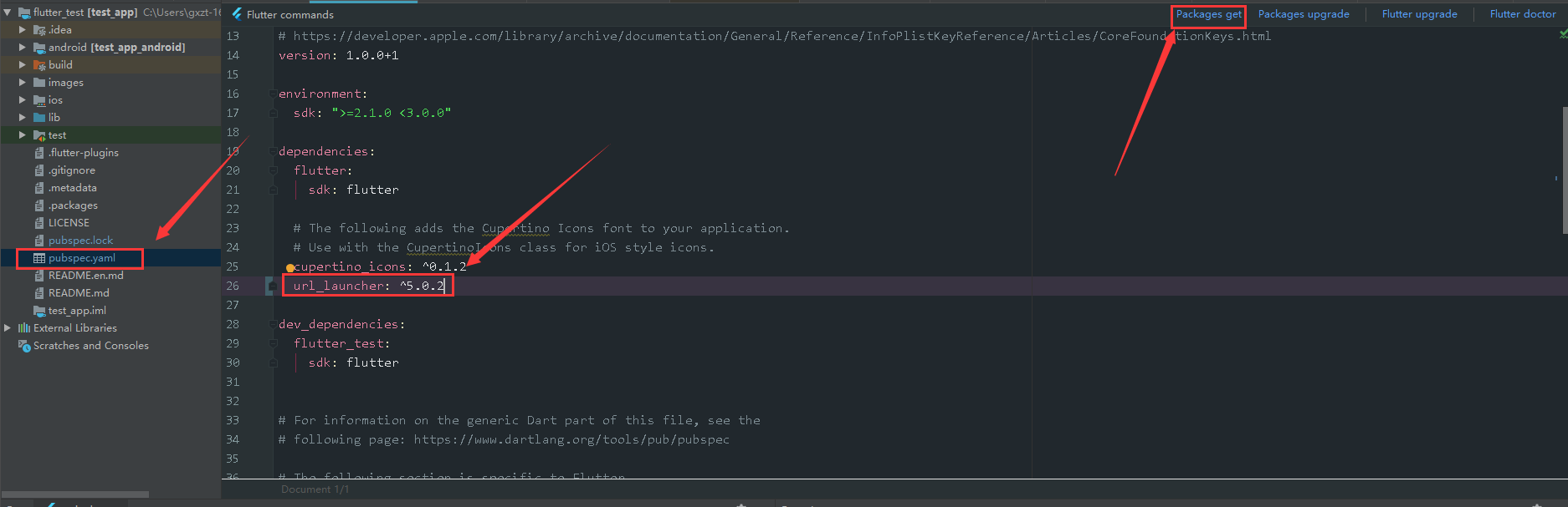首先在pubspec.yaml中添加url_launcher插件包,然后点击packages get进行安装