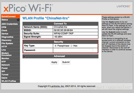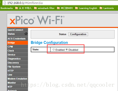 在浏览器地址栏中输入192.168.0.1,进入xPico-WiFi的配置界面,