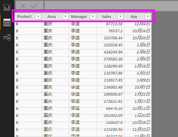 销售数据表Sales:日期 day、销售产品 Product (A和B两种)、销售大区 Area 、销售经理 Manager 以及销售金额 Sales。