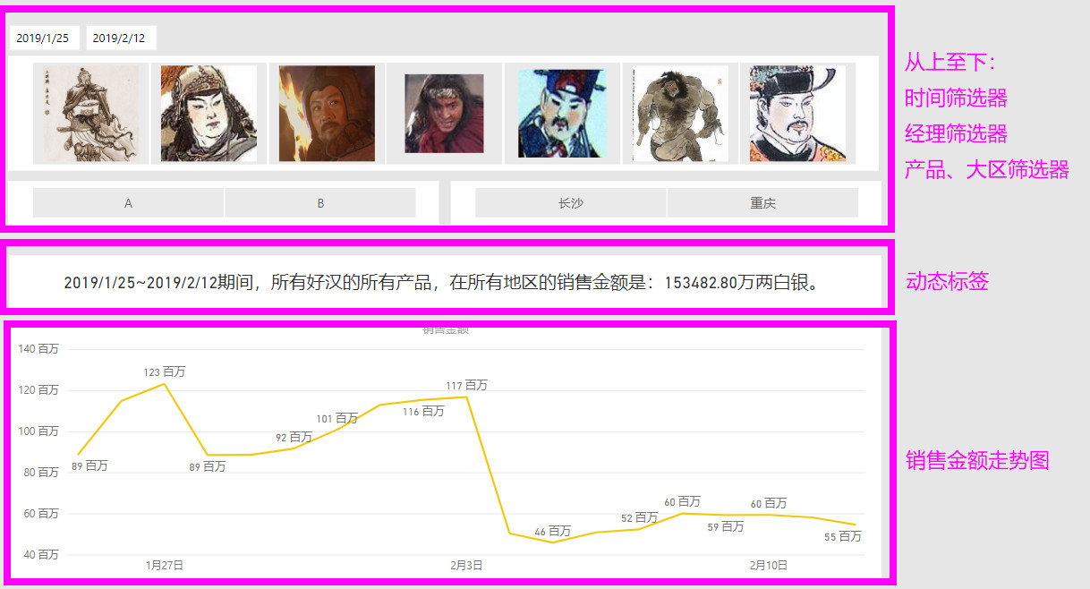动态标签的最终效果是,当用户选定了特定时间、经理、产品、大区时,标签能将这些信息同步展示出来,并将该条件下的总销售金额一并展示;当不选择任何筛选器时,默认展示所有数据。