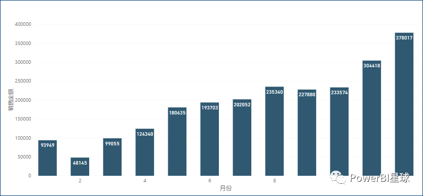 数据模型与前面文章中的相同,首先按照月份和销售额生成一个柱形图,