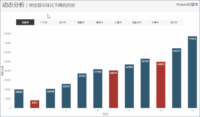 这样的设计效果肯定也是动态的,添加一个城市切片器,点击任意一个城市,都可以立即找出该城市销售额环比下降的月份,