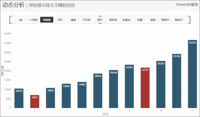 如果你还想按产品维度进行分析,找出某个产品的销售额在哪个月出现了下滑,只需要添加一个产品的切片器就可以了,