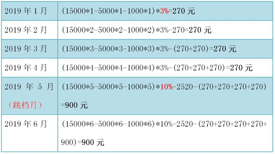 看吧,1~4月没跳档,一直3%税率交的钱就一直是270元。5月份跳一档多出部分都是10%税率,每月要交900元了。