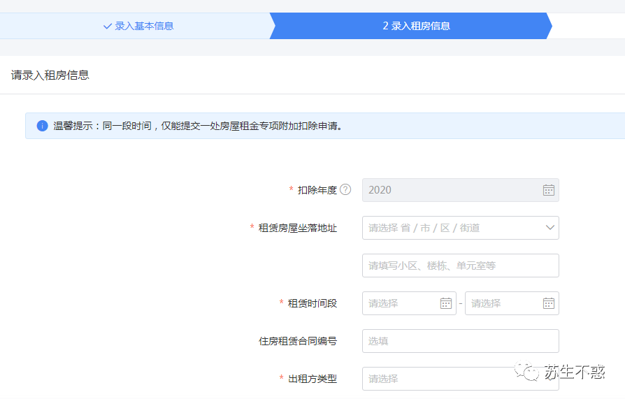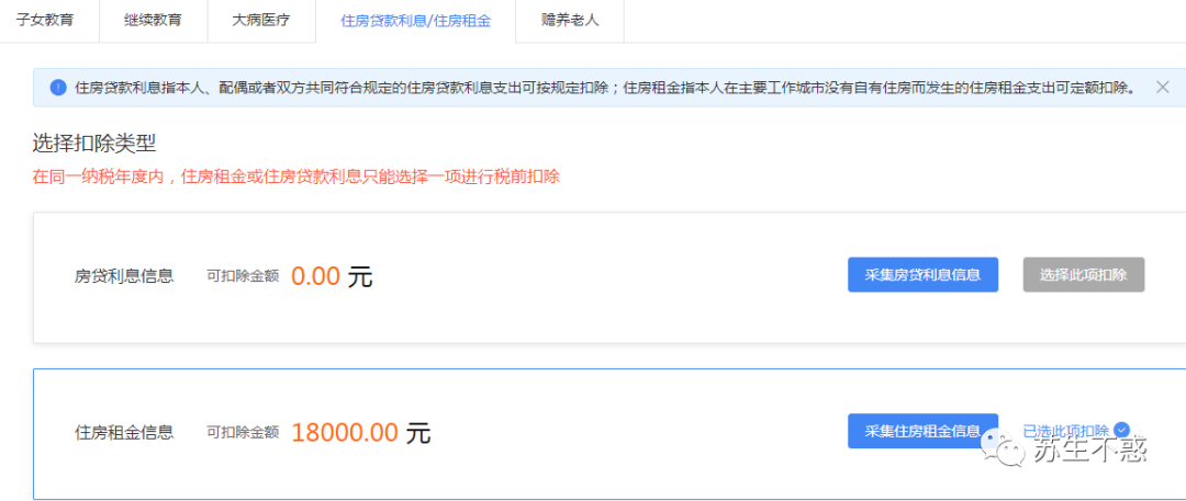 先填报专项附加扣除,包含子女教育,继续教育,大病医疗和赡养老人(60岁以上),房贷利息和住房租金,我选择了住房租金(和房贷利息只能二选一)。