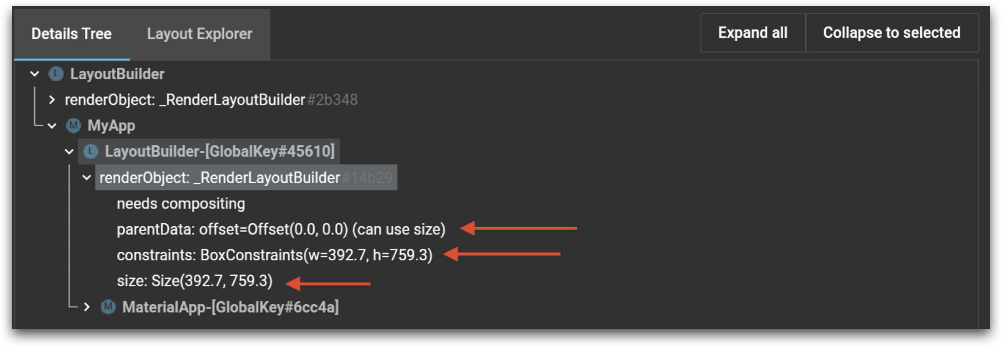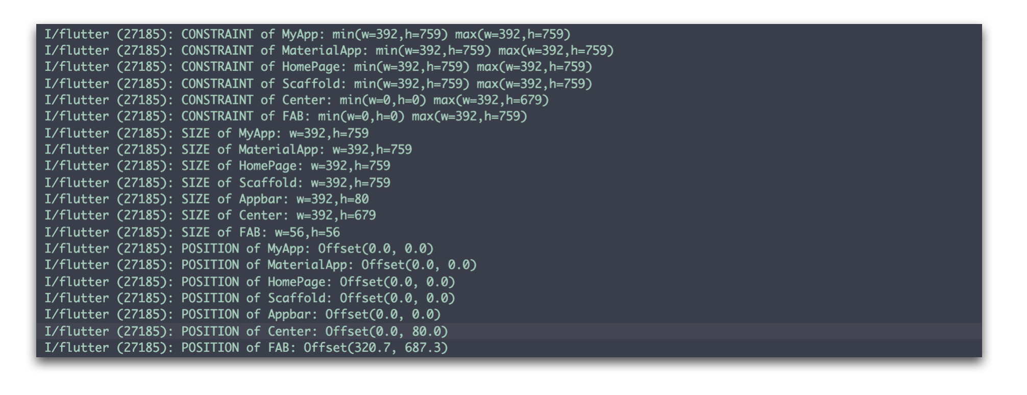 通过代码执行:我们可以使用LayoutBuilder在布局系统第一阶段拦截BoxConstraints传播,并检查约束。然后,在第二阶段完成后,我们使用键来获取小部件的RenderBox并能够检查Size,Position。