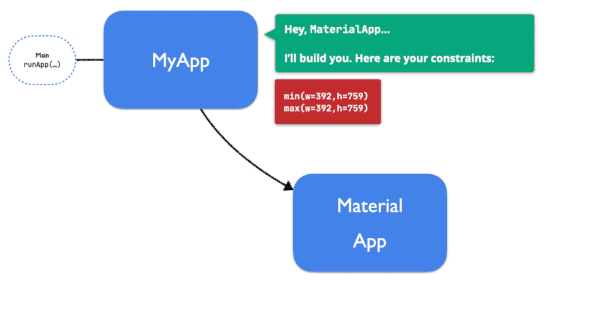 在我们的示例中发生的第一件事是执行runApp(..)。此函数检查屏幕当前大小(在我们的示例中为392:759),然后创建一个BoxConstraints对象,其中包含将发送到我们的第一个小部件(MyApp)的约束。注意,max | min的宽度和高度都相等;因此,runApp使用了严格的约束-通过这样做,MyApp除了选择屏幕上的可用空间外,在选择其大小时将别无选择。