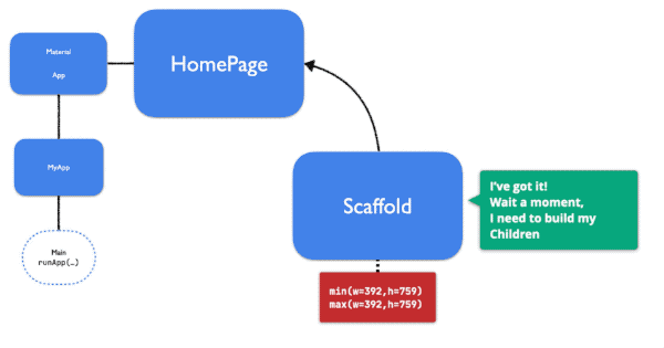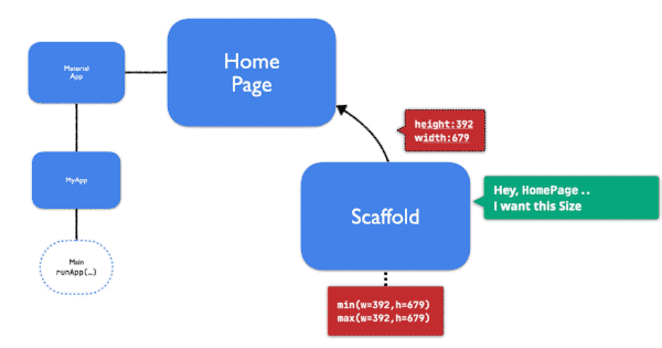 然后将约束向下传播到Widget树。 MyApp,MaterialApp,HomePage和Scaffold都被告知相同的严格约束。因此,所有人将被迫填满整个屏幕。每个小部件都有机会向其子项通知不同的BoxConstraints(仍然尊重已收到的子项)。但是,在这种情况下,他们选择不这样做。