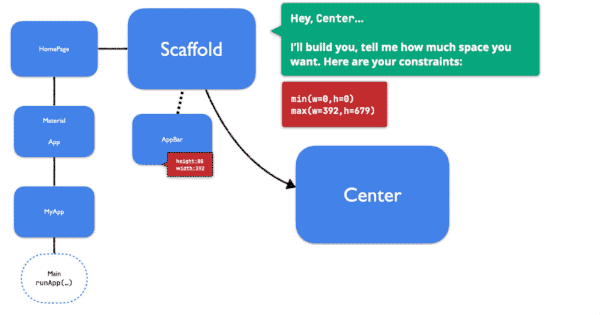 - Scaffold告知Center其约束,让其选择在 0 < width < 392 和 0 < height < 697 中选择。请注意,最大高度为759(屏幕最大高度)减去80(AppBar选择的高度)。