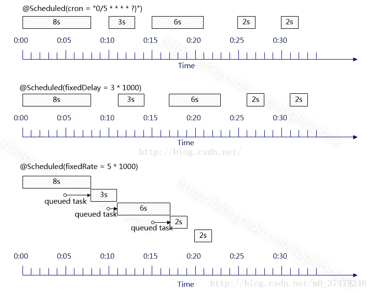 fixedDelay:从上个任务执行完成但下个任务的开启时的时间间隔是固定的。