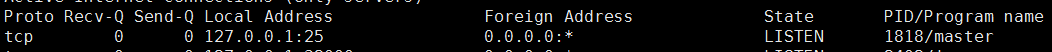 25端口被占用,被一个叫master的玩意占了,好家伙,看看是什么东西,运行ps -f -p 1818看一下结果,1818为当前这个程序的进程号PID,可以看到是: