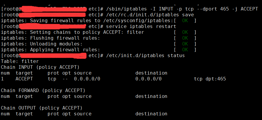 sbin/iptables -I OUTPUT -p tcp –dport 465 -j ACCEPT 打通465端口