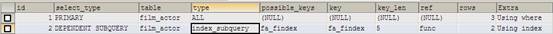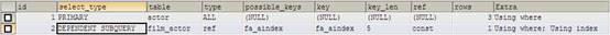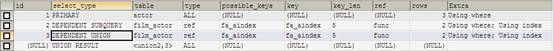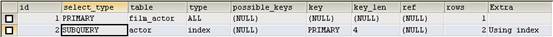 例如:EXPLAIN SELECT (SELECT actor_id FROM actor) FROM film_actor