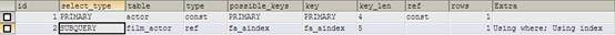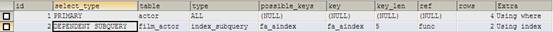 例如:EXPLAIN SELECT * FROM actor WHERE actor_id IN (SELECT actor_id FROM actor)