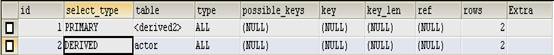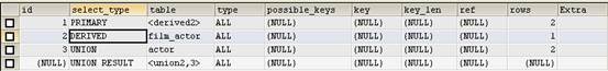 例如:EXPLAIN SELECT * FROM (SELECT * FROM actor) AS a。此时table列会显示<derivedN>,其中N对应id列的值。