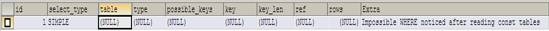 unique row not found:对于SELECT … FROM tbl_name,没有行满足unique index或者primary key。从表中查询id不存在的一个值会显示Impossible WHERE noticed after reading const tables。