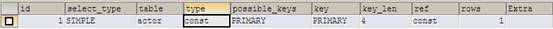 例如:EXPLAIN SELECT * FROM actor WHERE actor_id = 1(其中actor_id是主键)