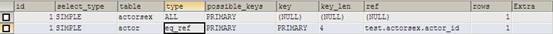 例如:EXPLAIN SELECT * FROM actor, actorsex WHERE actor.actor_id = actorsex.actor_id(其中actor_id是actor、actorsex的主键,且actorsex中只有一条记录,如果多于一条记录就不是eq_ref)