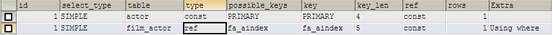 actor_id为唯一性索引时,会显示“No matching min/max row”,否则会显示“using where”。