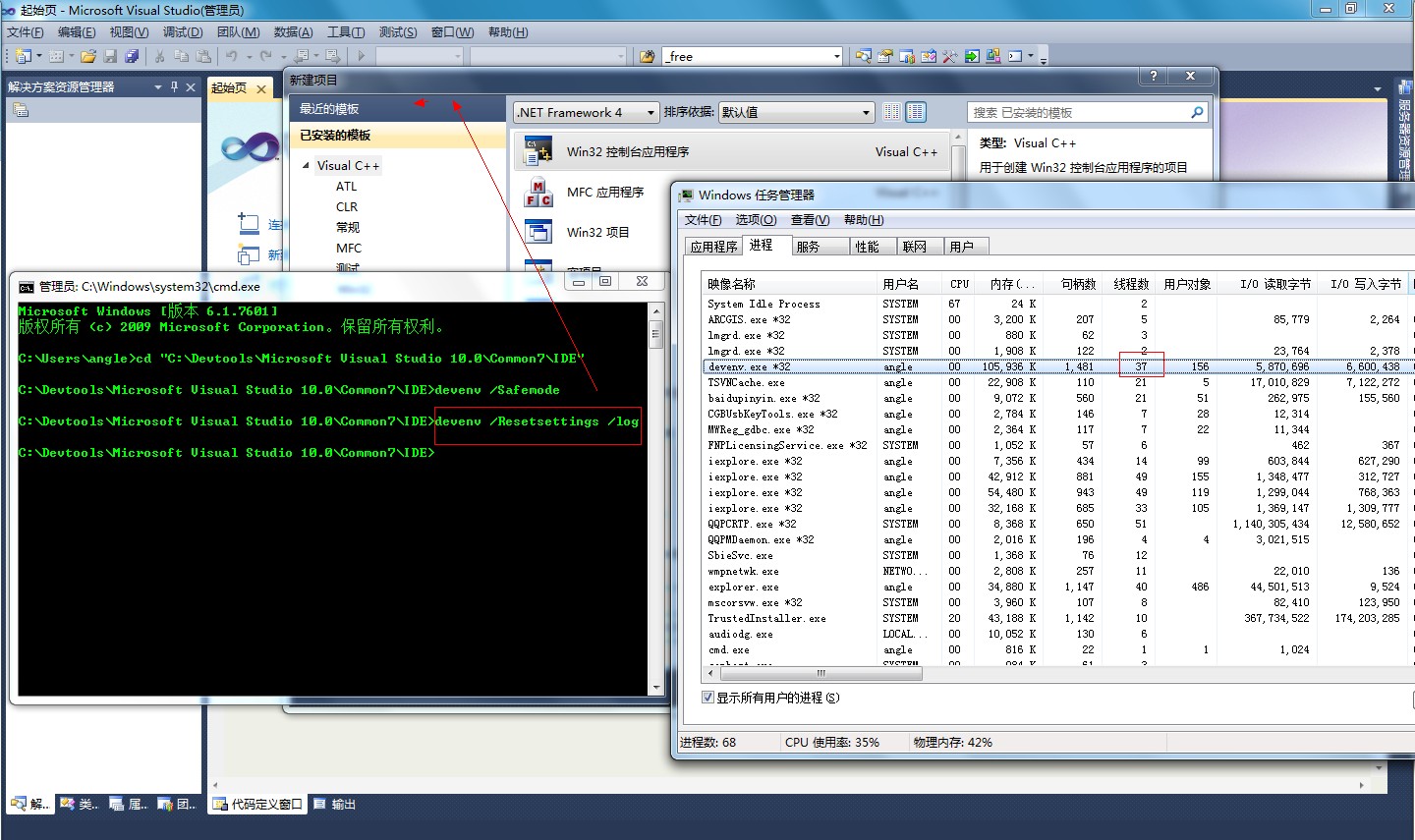 1 打开开始菜单》所有程序》Microsoft Visual Studio》Visual Studio工具》Visual Studio命令行(以管理员身份); 2 激活Visual Studio的日志功能:输入Devenv.exe /log。参见:http://msdn.microsoft.com/zh-cn/library/ms241272.aspx; 3 尝试运行下面的几个devenv开关:devenv /Resetsettings,devenv /ResetSkipPkgs, devenv /Safemode; 4 重新启动系统并进入安全模式,这样可以消除一些第三方的程序/驱动的影响; 5 尝试建立并使用新的用户登陆系统。