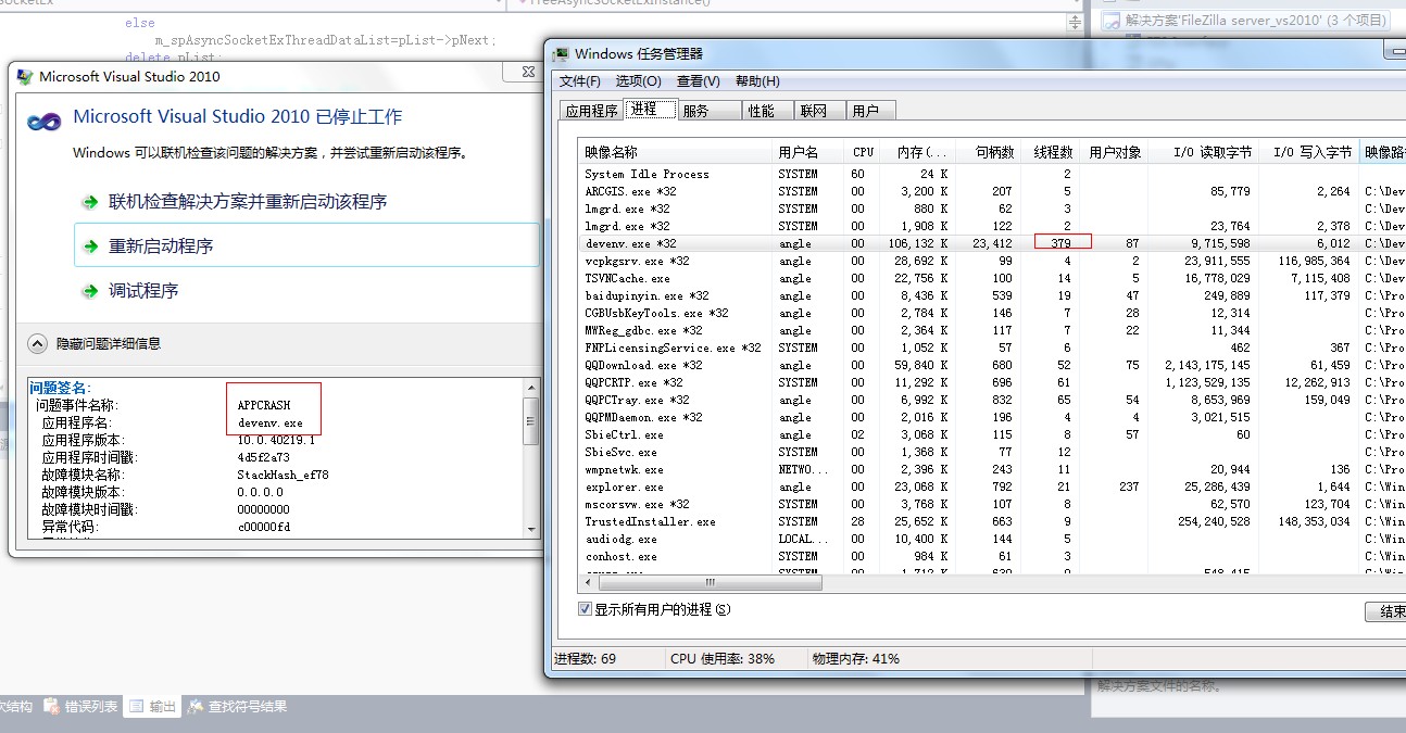 也不知道到底怎么了,就出现这种奇怪的问题了,只要是新建项目或者新建文件,VS2010 就卡死,发现线程数 由开始的30 突增 到370多个,然后CPU利用率居高,最后堆栈溢出,崩溃。下面就是崩溃的截图:
