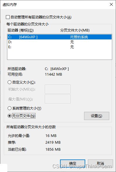 蓝屏代码出现page fault in nonpaged area,页面文件出了问题,重新设置页面文件大小和位置或者禁用页面文件。我的是禁用了页面文件,然后就没有问题了。