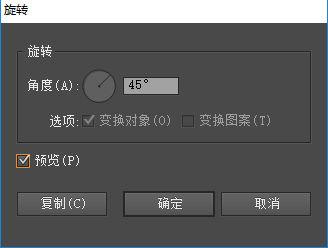 2、选中矩形,点击旋转工具,角度设置为:45度,点击“复制“;