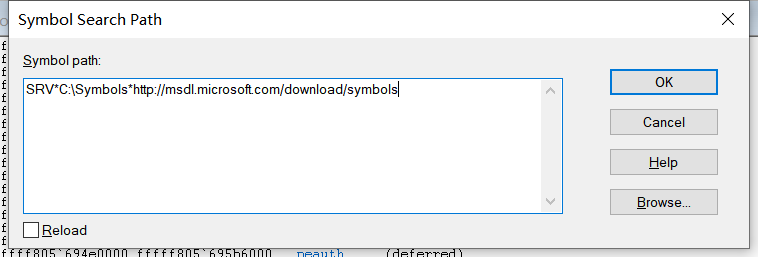 - 然后,输入:SRV*C:Symbols*http://msdl.microsoft.com/download/symbols,点击OK
