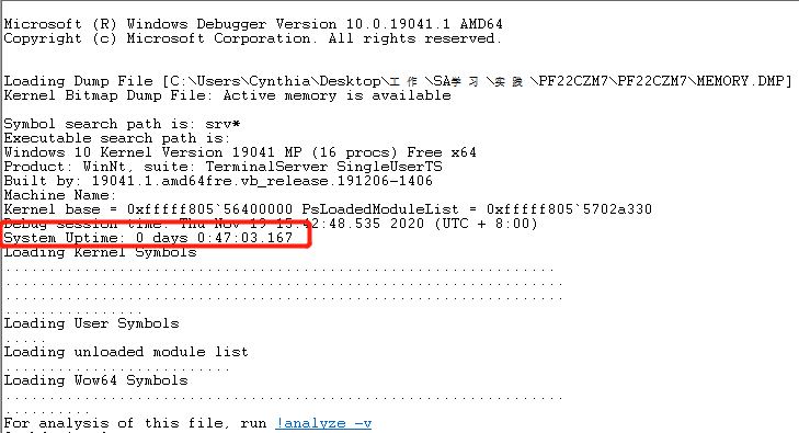 打开蓝屏dmp文件后,显示参数System Uptime表示系统运行时间。从该参数可以得知蓝屏出现的时间,从而进行蓝屏定位,例如小于1分钟为开机蓝屏,大于1分钟为上机或者玩的过程中出现问题。如下图,在系统运行后的47分钟3秒167毫秒出现了蓝屏。