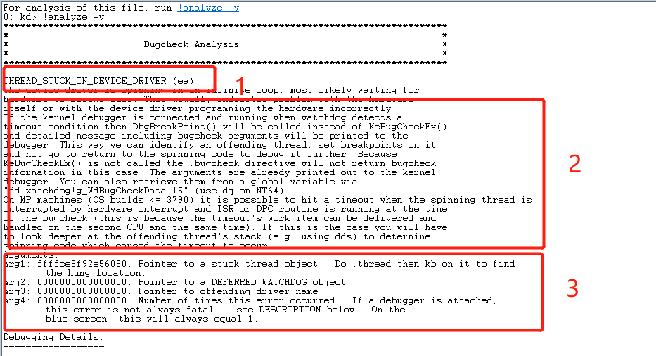 有时,在打开蓝屏dmp文件之后,会显示一个参数:Probaly caused by,表示可能导致蓝屏的驱动文件。如果没有这个参数,需要使用命令!analyze -v进行进一步分析。下图为执行命令!analyze -v之后显示的一个界面: