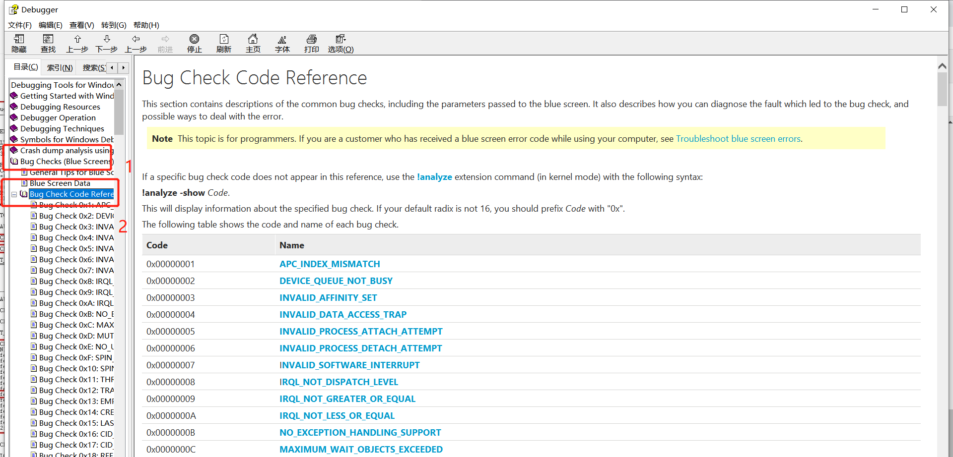 这里通过点击help--Window,或者键盘F1进入帮助页面,查看蓝屏代码对应的参考信息,如下图。