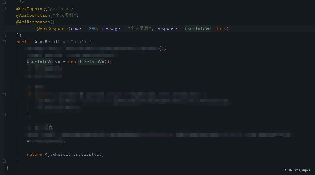@ApiResponses({ @ApiResponse(code = 200, message = "个人资料", response = UserInfoVo.class) })说明1: 主动指明返回的参数;为什么要这么做?因为外层是extendHashMap实现的,所以外层渲染报错,直接渲染业务参数