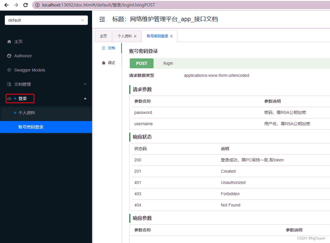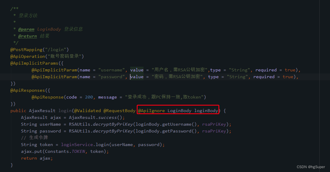 @ApiImplicitParams({ @ApiImplicitParam(name = "username", value = "用户名,需RSA公钥加密",type = "String", required = true), @ApiImplicitParam(name = "password", value = "密码,需RSA公钥加密", type = "String", required = true), })说明: 此注解,逐个描述;如果没有入参,则不需要注解