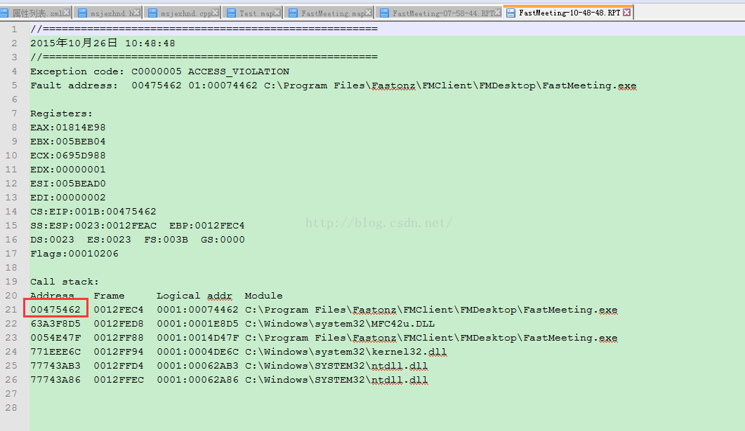 以下是RTP文件,通过RTP堆栈信息地址找到map中对应的地址,如 00475462 ,则我们查找一般以004754查找,因为地址一般在一个范围,不那么精确