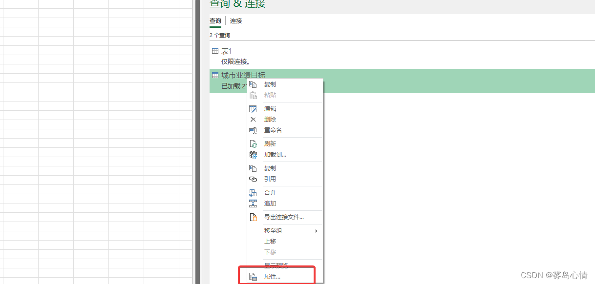 Excel集成的PowerQuery提供了数据的手动刷新功能之外,也提供了数据的自动刷新功能。需要注意的是,PowerQuery提供的自动刷新功能是针对连接的,也就是说在PowerQuery自动刷新功能不是全局刷新功能,而是针对连接本身提供。接下来我们来看一下如何实现PowerQuery连接的自动刷新操作,在进行数据查询连接中点击右键->属性进入到属性菜单,图1为属性菜单进入方式。