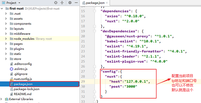可以在项目根目录下的package.json中修改项目启动的IP地址和端口号,默认为"127.0.0.1:3000"