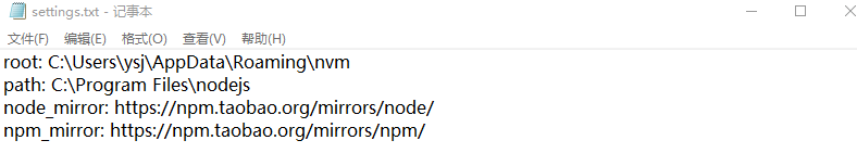 nvm node_mirror [url] 设置node镜像,默认url是https://nodejs.org/dist/,设置url后可在安装nvm的目录下settings.txt文件查看,也可操作