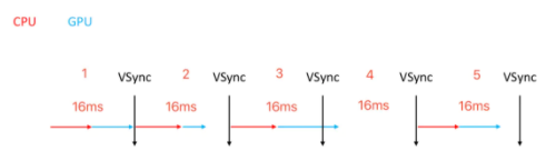 在一帧显示的频率16ms中,如果CPU和GPU没有将要显示的内容渲染到帧缓存中,当前垂直同步信号到来的时候,就会显示上一帧的内容;这一帧的内容,会在下一个周期16ms后,垂直同步信号再次到来的时候,显示到屏幕上。