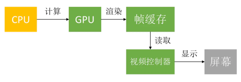 之前介绍,屏幕成像在CPU计算和GPU渲染到帧缓存区之后,再由视频控制器读取并显示到屏幕上。如下图所示: