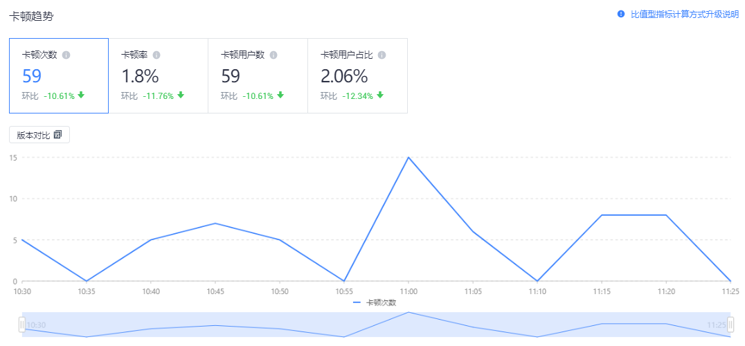卡顿趋势:查看不同时间段、筛选维度下的卡顿数据趋势;