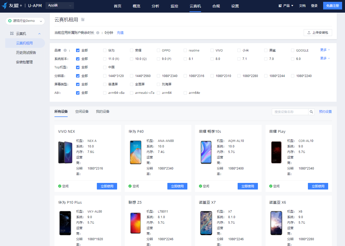 U-APM 云真机中提供了海量 Android 、iOS 真机,供您在发版前测试、发现线上问题后复现等场景使用,节约您购买大量机型做测试的成本。提供了灵活地测试操作界面,支持ADB调试、WEB远程调试、扫码、抓包、虚拟定位等测试功能,并提供了测试报告供您后续查看。