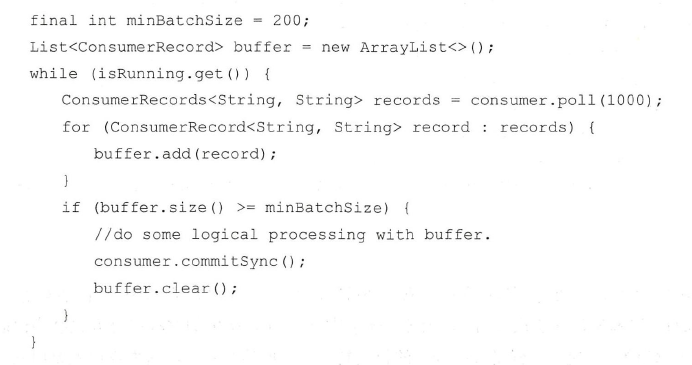 可以看到示例中先对拉取到的每一条消息做相应的逻辑处理,然后对整个消息集做同步提交。参考KafkaConsumer 源码中提供的示例,针对上面的示例还可以修改为批量处理+批量提交的方式, 关键代码如下: