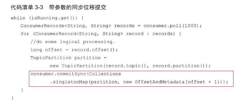 该方法提供了一个offsets 参数, 用来提交指定分区的位移。无参的commitSync()方法只能提交当前批次对应的position 值。如果需要提交一个中间值,比如业务每消费一条消息就提交一次位移,那么就可以使用这种方式,我们来看一下代码示例,如代码清单3-3 所示。