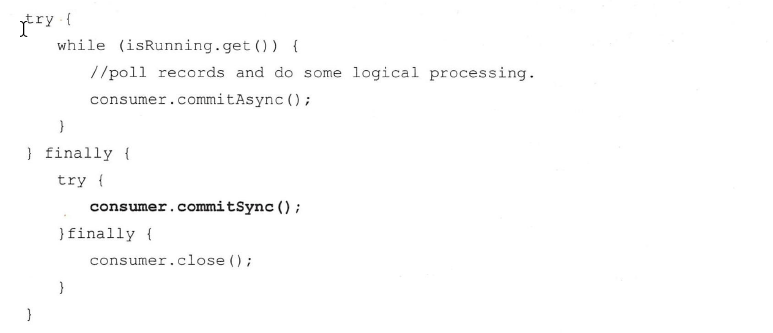 示例代码中加粗的部分是在消费者正常退出时为位移提交“把关”添加的。发生再均衡情况的“把关”会在3.2 . 8 节中做详细介绍。
