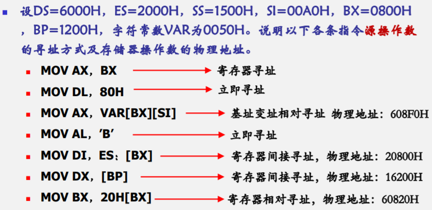 (2)寄存器寻址:DS←BX/SI/DI;SS←BP