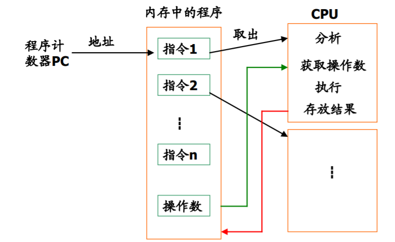 - 过程:取指令->分析指令->读取操作数->执行指令->存放结果