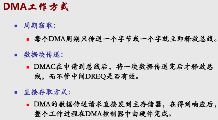 ②总线由DMA控制器(DMAC)进行控制(CPU要放弃总线控制权),内存/外设的地址和读写控制信号均由DMAC提供。