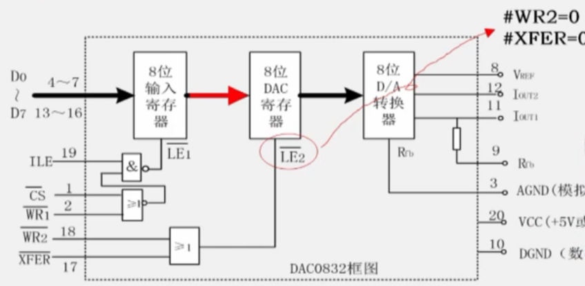 - 主要引脚功能:D7-D0,ILE,CS,WR1,WR2,XFER(低电平有效)
